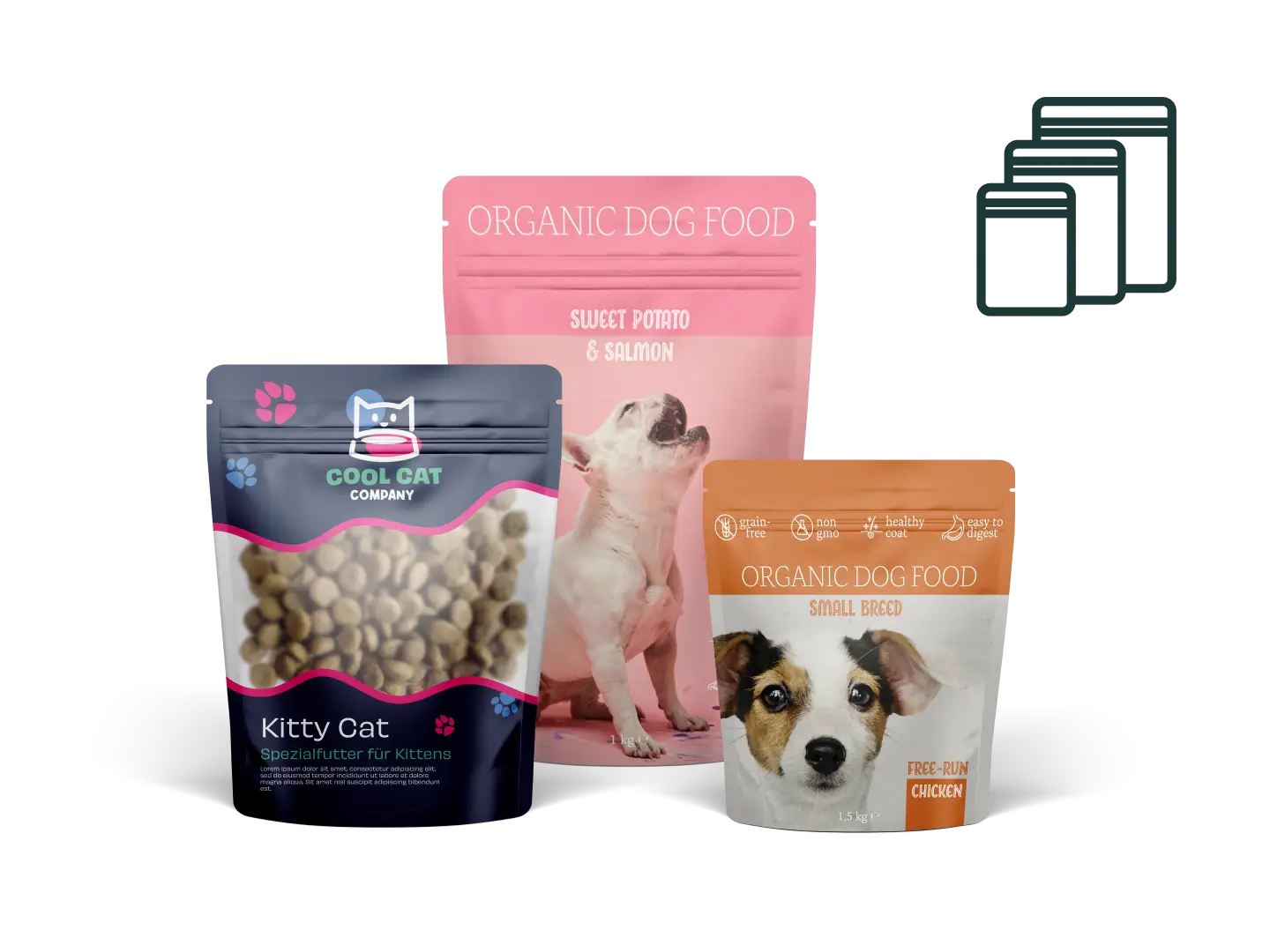 Unsere flexible Beutelverpackung für Tierprodukte gibt’s in vielen Größen und Materialien, von recyclingfähigen Lösungen bis hin zu Designs mit praktischem Klettzipper, der sich immer wieder sicher verschließen lässt. So bleibt dein Tierfutter aromatisch, die Handhabung easy und dein Produkt hebt sich im Regal klar ab.